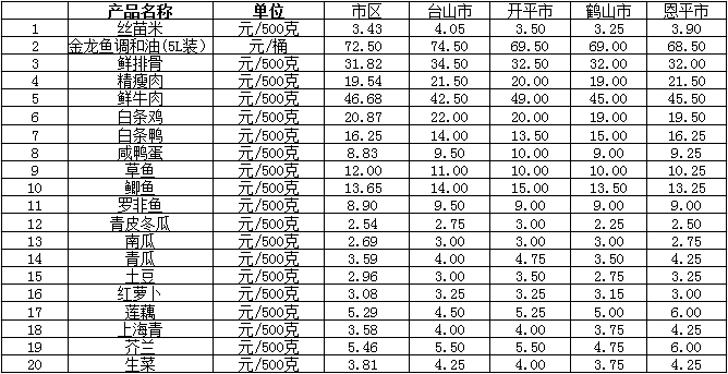 說(shuō)明:1、表中價(jià)格為該地區(qū)監(jiān)測(cè)點(diǎn)綜合平均價(jià);2、“市區(qū)”含蓬江區(qū)、江海區(qū)、新會(huì)區(qū),價(jià)格分別采自蓬江市場(chǎng)、江南市場(chǎng)、城東市場(chǎng)等13家農(nóng)貿(mào)市場(chǎng);3、其他四個(gè)縣市價(jià)格分別采自新華市場(chǎng)、錦江市場(chǎng)等8家農(nóng)貿(mào)市場(chǎng)。