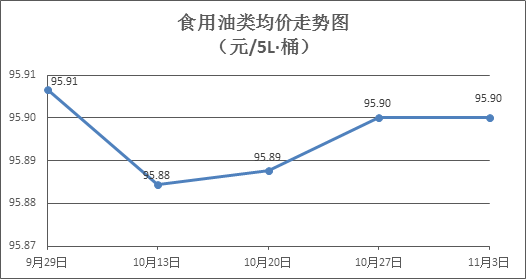 食用油類(lèi)商品價(jià)格平穩(wěn)。所監(jiān)測(cè)的9種食用油(5L裝)商品價(jià)格均持平,綜合零售均價(jià)為每桶95.90元,環(huán)比持平。其中:金龍魚(yú)花生油、金龍魚(yú)調(diào)和油零售均價(jià)為每桶102.81元、71.29元,環(huán)比均持平。