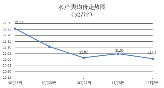 水產(chǎn)類商品價(jià)格升降互現(xiàn)。所監(jiān)測的9種水產(chǎn)商品價(jià)格波動(dòng)情況為5漲4跌,綜合均價(jià)為每斤21.01元,環(huán)比下降0.16%。其中:草魚、鯽魚、羅非魚、海蝦零售均價(jià)分別為每斤11.07元、13.91元、9.04元、49.00元,環(huán)比分別上漲0.31%、上漲0.28%、下降0.07%、下降1.21%。