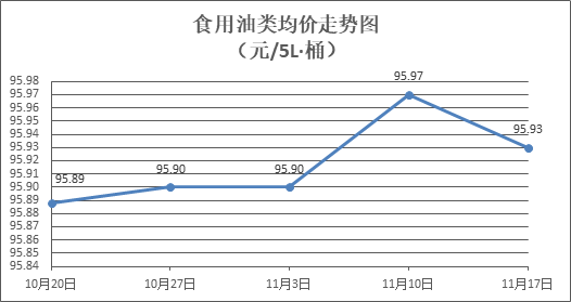 食用油類商品價(jià)格穩(wěn)中有降。所監(jiān)測的9種食用油(5L裝)商品價(jià)格波動(dòng)情況為3跌6平,綜合零售均價(jià)為每桶95.93元,環(huán)比下降0.04%。其中:金龍魚花生油、金龍魚調(diào)和油零售均價(jià)為每桶102.70元、71.21元,環(huán)比分別下降0.11%、持平。