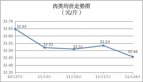 肉類商品價(jià)格微幅盤降。所監(jiān)測(cè)的8種肉類商品價(jià)格波動(dòng)情況為1漲5跌2平,綜合零售均價(jià)為每斤32.46元,環(huán)比下降0.23%。其中:排骨、精瘦肉、牛肉、帶骨羊肉零售均價(jià)分別為每斤32.10元、20.05元、45.80元、41.67元,環(huán)比分別下降0.77%、持平、下降0.17%、下降0.36%。