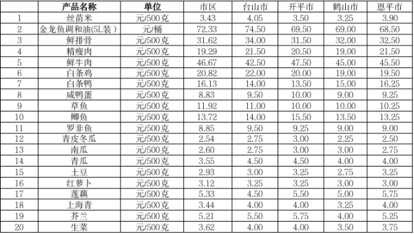 說明:1、表中價(jià)格為該地區(qū)監(jiān)測(cè)點(diǎn)綜合平均價(jià);2、“市區(qū)”含蓬江區(qū)、江海區(qū)、新會(huì)區(qū),價(jià)格分別采自蓬江市場(chǎng)、江南市場(chǎng)、城東市場(chǎng)等13家農(nóng)貿(mào)市場(chǎng);3、其他四個(gè)縣市價(jià)格分別采自新華市場(chǎng)、錦江市場(chǎng)等8家農(nóng)貿(mào)市場(chǎng)。