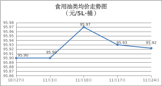 食用油類商品價(jià)格穩(wěn)中微降。所監(jiān)測(cè)的9種食用油(5L裝)商品價(jià)格波動(dòng)情況為2跌7平,綜合零售均價(jià)為每桶95.92元,環(huán)比下降0.01%。其中:金龍魚花生油、金龍魚調(diào)和油零售均價(jià)為每桶102.67元、71.21元,環(huán)比分別下降0.03%、持平。
