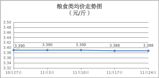 糧食類商品價(jià)格保持穩(wěn)定。所監(jiān)測(cè)的4種糧食類商品價(jià)格均持平,零售均價(jià)為每斤3.388元。其中:油粘米、富強(qiáng)粉零售均價(jià)分別為每斤3.51元、3.36元,環(huán)比均持平。