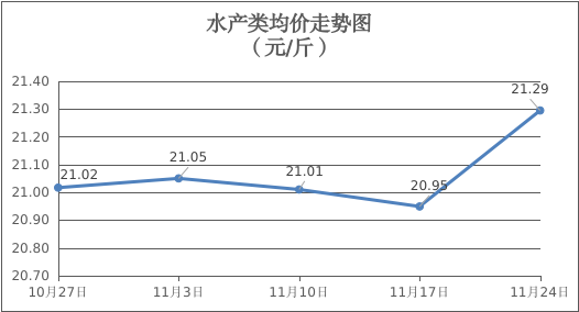水產(chǎn)類商品價(jià)格升降互現(xiàn)。所監(jiān)測(cè)的9種水產(chǎn)商品價(jià)格波動(dòng)情況為2漲5跌2平,綜合均價(jià)為每斤21.29元,環(huán)比上漲1.65%。其中:草魚、鯽魚、羅非魚、海蝦零售均價(jià)分別為每斤11.00元、13.91元、9.01元、51.70元,環(huán)比分別下降0.27%、持平、下降0.11%、上漲6.60%。