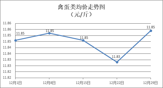禽蛋類商品價格略有回升。所監(jiān)測的5種禽蛋類商品價格波動情況為3漲2平,綜合零售均價為每斤11.85元,環(huán)比上漲0.22%。其中:白條雞、白條鴨零售均價分別為每斤20.64元、15.25元,環(huán)比分別上漲0.44%、上漲0.20%;雞蛋、咸鴨蛋零售均價分別為每斤6.55元、9.15元,環(huán)比分別持平、上漲0.11%。