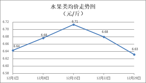 水果類商品價格總體略降。所監(jiān)測的6種水果商品價格波動情況為1漲4跌1平,綜合零售均價為每斤6.63元,環(huán)比下降0.72%。其中橙子、蘋果、葡萄零售均價分別為每斤5.84元、7.36元、13.89元,環(huán)比分別下降2.01%、下降0.94%、下降0.50%。