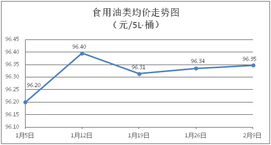 食用油類商品價(jià)格穩(wěn)中微漲。所監(jiān)測(cè)的9種食用油(5L裝)商品價(jià)格波動(dòng)情況為2漲7平,綜合零售均價(jià)為每桶96.35元,環(huán)比上漲0.01%。其中:魯花花生油、金龍魚調(diào)和油零售均價(jià)為每桶155.96元、72.00元,環(huán)比分別上漲0.01%、上漲0.06%。