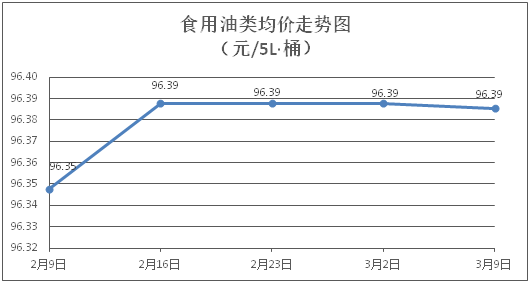 食用油類商品價(jià)格基本平穩(wěn)。所監(jiān)測(cè)的9種食用油(5L裝)商品價(jià)格波動(dòng)情況為1跌8平,綜合零售均價(jià)為每桶96.39元,環(huán)比下降0.002%。其中:魯花花生油、玉米油零售均價(jià)為每桶156.04元、76.65元,環(huán)比分別持平、下降0.03%。