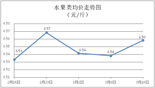 水果類商品價(jià)格略有上漲。所監(jiān)測(cè)的6種水果商品價(jià)格波動(dòng)情況為4漲1跌1平,綜合零售均價(jià)為每斤6.56元,環(huán)比上漲0.31%。其中橙子、蘋果、葡萄零售均價(jià)分別為每斤6.01元、7.51元、13.75元,環(huán)比分別上漲0.67%、上漲0.27%、上漲0.51%。