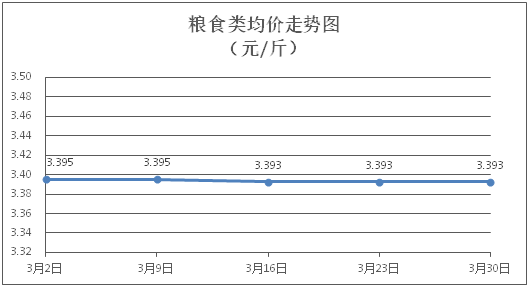糧食類商品價格基本平穩(wěn)。所監(jiān)測的4種糧食類商品價格均持平,綜合零售均價為每斤3.393元。其中:絲苗米、面粉零售均價分別為每斤3.53元、3.40元,環(huán)比均持平。