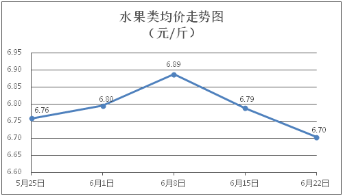 水果類商品價(jià)格小幅波動(dòng)。所監(jiān)測(cè)的6種水果商品價(jià)格波動(dòng)情況為3漲3跌,綜合零售均價(jià)為每斤6.70元,環(huán)比下降1.25%。其中橙子、香蕉、葡萄零售均價(jià)分別為每斤6.46元、3.45元、14.00元,環(huán)比分別下降0.92%、上漲0.29%、下降3.38%。