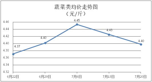 蔬菜類商品價(jià)格總體略降。所監(jiān)測的32 種蔬菜商品價(jià)格波動(dòng)情況為10漲19跌3平,綜合零售均價(jià)為每斤4.40元,環(huán)比下降0.61%。其中:漲幅居前的品種包括青尖椒、西洋菜、蒜苔,零售均價(jià)分別為每斤4.43元、4.11元、7.67元,環(huán)比分別上漲2.31%、1.48%、1.19%;跌幅靠前的品種包括蓮藕、白莧菜、生菜,零售均價(jià)分別為每斤5.39元、3.97元、3.89元,環(huán)比分別下降3.92%、2.70%、2.51%。