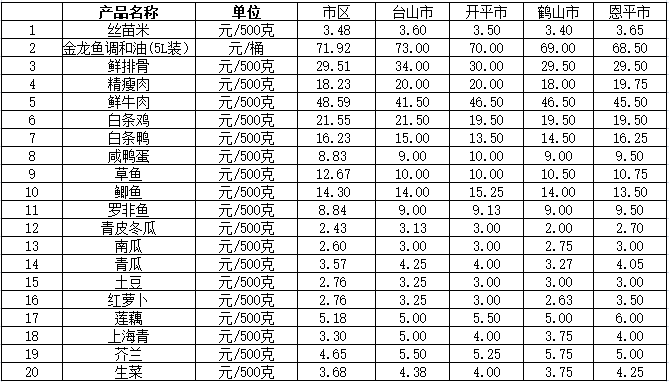 說(shuō)明:1、表中價(jià)格為該地區(qū)監(jiān)測(cè)點(diǎn)上周綜合平均價(jià);2、“市區(qū)”含蓬江區(qū)、江海區(qū)、新會(huì)區(qū),價(jià)格分別采自蓬江市場(chǎng)、江南市場(chǎng)、城東市場(chǎng)等13家農(nóng)貿(mào)市場(chǎng);3、其他四個(gè)縣市價(jià)格分別采自新華市場(chǎng)、錦江市場(chǎng)等8家農(nóng)貿(mào)市場(chǎng)。