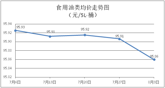 食用油類(lèi)商品價(jià)格穩(wěn)中微降。所監(jiān)測(cè)的9種食用油(5L裝)商品價(jià)格波動(dòng)情況為2跌7平,綜合零售均價(jià)為每桶95.86元,環(huán)比下降0.05%。其中:金龍魚(yú)花生油、金龍魚(yú)調(diào)和油零售均價(jià)為每桶102.83元、70.89元,環(huán)比分別持平、下降0.49%。
