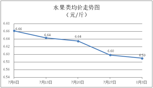 水果類(lèi)商品價(jià)格持續(xù)走弱。所監(jiān)測(cè)的6種水果商品價(jià)格波動(dòng)情況為1漲3跌2平,綜合零售均價(jià)為每斤6.59元,環(huán)比下降0.13%。其中橙子、香蕉、葡萄零售均價(jià)分別為每斤6.68元、3.34元、13.60元,環(huán)比分別上漲2.14%、下降0.89%、下降1.09%。