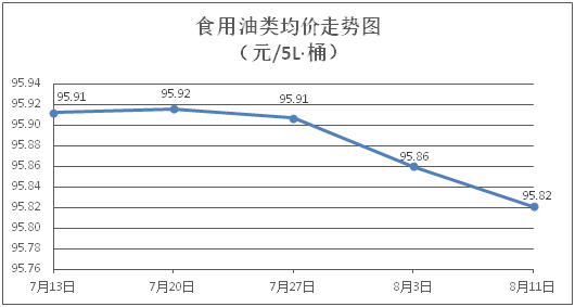 食用油類商品價格穩(wěn)中微降。所監(jiān)測的9種食用油(5L裝)商品價格波動情況為1漲4跌4平,綜合零售均價為每桶95.82元,環(huán)比下降0.04%。其中:金龍魚花生油、金龍魚調(diào)和油零售均價為每桶102.62元、70.82元,環(huán)比分別下降0.20%、下降0.10%。