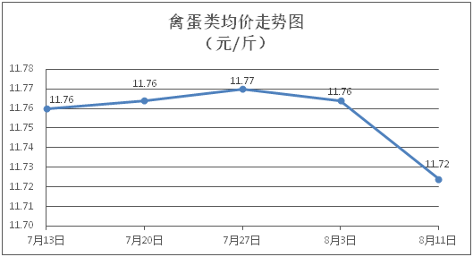 禽蛋類商品價格總體略降。所監(jiān)測的5種禽蛋類商品價格波動情況為2漲2跌1平,綜合零售均價為每斤11.72元,環(huán)比下降0.34%。其中:白條雞、白條鴨零售均價分別為每斤20.77元、15.21元,環(huán)比分別上漲0.53%、下降1.36%;雞蛋、鴨蛋零售均價分別為每斤6.42元、7.08元,環(huán)比分別下降1.68%、上漲0.14%。