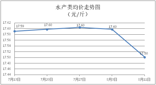 水產(chǎn)類商品價格有所下降。所監(jiān)測的9種水產(chǎn)商品價格波動情況為3漲4跌2平,綜合均價為每斤17.50元,環(huán)比下降0.55%。其中:草魚、鳙魚、鱸魚、基圍蝦零售均價分別為每斤11.32元、10.69元、23.13元、29.79元,環(huán)比分別持平、下降0.65%、上漲0.26%、下降3.28%。