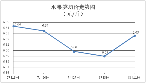 水果類商品價格漲跌互現(xiàn)。所監(jiān)測的6種水果商品價格波動情況為3漲3跌,綜合零售均價為每斤6.63元,環(huán)比上漲0.56%。其中橙子、香蕉、葡萄零售均價分別為每斤6.86元、3.29元、13.59元,環(huán)比分別上漲2.69%、下降1.50%、下降0.07%。