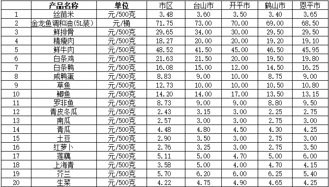 說明:1、表中價格為該地區(qū)監(jiān)測點上周綜合平均價;2、“市區(qū)”含蓬江區(qū)、江海區(qū)、新會區(qū),價格分別采自蓬江市場、江南市場、城東市場等13家農(nóng)貿(mào)市場;3、其他四個縣市價格分別采自新華市場、錦江市場等8家農(nóng)貿(mào)市場。