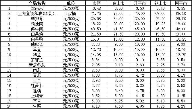說明:1、表中價(jià)格為該地區(qū)監(jiān)測點(diǎn)上周綜合平均價(jià);2、“市區(qū)”含蓬江區(qū)、江海區(qū)、新會(huì)區(qū),價(jià)格分別采自蓬江市場、江南市場、城東市場等13家農(nóng)貿(mào)市場;3、其他四個(gè)縣市價(jià)格分別采自新華市場、錦江市場等8家農(nóng)貿(mào)市場。