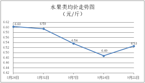 水果類商品價(jià)格有所回升。所監(jiān)測的6種水果商品價(jià)格波動(dòng)情況為4漲2跌,綜合零售均價(jià)為每斤6.53元,環(huán)比上漲0.59%。其中橙子、香蕉、梨零售均價(jià)分別為每斤7.38元、3.01元、5.31元,環(huán)比分別上漲3.22%、下降1.31%、上漲1.53%。
