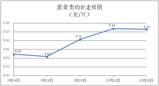 蔬菜類商品價格總體略降。所監(jiān)測的32 種蔬菜商品價格波動情況為9漲18跌5平,綜合零售均價為每斤5.13元,環(huán)比下降0.15%。其中:漲幅居前的品種包括青尖椒、苦瓜、芥蘭,零售均價分別為每斤6.17元、5.52元、6.00元,環(huán)比分別上漲6.75%、2.41%、1.01%;跌幅靠前的品種為花菜、白蘿卜、萵筍,零售均價分別為每斤5.40元、2.29元、4.97元,環(huán)比分別下降2.70%、2.14%、1.97%。