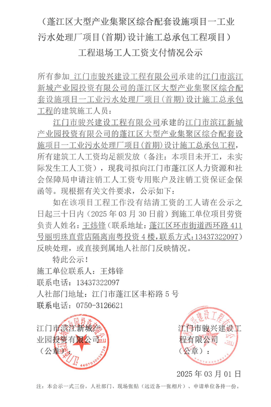 現(xiàn)將蓬江區(qū)大型產(chǎn)業(yè)集聚區(qū)綜合配套設(shè)施項目—工業(yè)污水處理廠項目(首期)設(shè)計施工總承包工程《工程竣工退場工人工資支付情況公示》掛網(wǎng)公示如下,如發(fā)現(xiàn)該項目存在欠薪等相關(guān)情況的,請在30日內(nèi),請攜帶相關(guān)佐證材料,到施工單位項目或者人社部門反映情況。