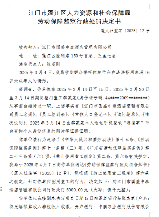你單位該行為違法了《中華人民共和國(guó)勞動(dòng)法》第十五條、《勞動(dòng)保障監(jiān)察條例》第十一條第(三)項(xiàng)、《廣東省勞動(dòng)保障監(jiān)察條例》第二十三條第(六)項(xiàng)、《禁止使用童工規(guī)定》第二條、第六條有關(guān)規(guī)定,我局于2025年4月7日向你單位送達(dá)《勞動(dòng)保障監(jiān)察行政處罰告知書》(蓬人社監(jiān)字〔2025〕12號(hào))。現(xiàn)根據(jù)《禁止使用童工規(guī)定》第六條之規(guī)定,針對(duì)你單位招用童工的行為,決定如下:對(duì)江門市國(guó)盛中泰酒店管理有限公司行政處罰5000.00元(大寫:伍仟元整)。
