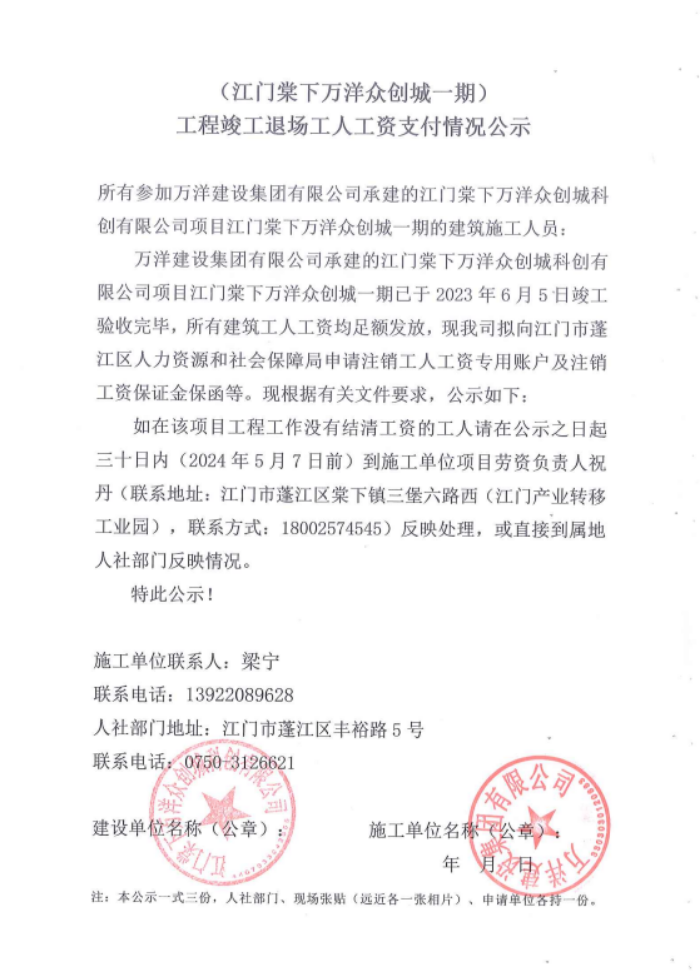 現(xiàn)將江門(mén)棠下萬(wàn)洋眾創(chuàng)城一期工程項(xiàng)目《工程竣工退場(chǎng)工人工資支付情況公示》掛網(wǎng)公示如下,如發(fā)現(xiàn)該項(xiàng)目存在欠薪等相關(guān)情況的,請(qǐng)?jiān)?0日內(nèi),請(qǐng)攜帶相關(guān)佐證材料,到施工單位項(xiàng)目或者人社部門(mén)反映情況。