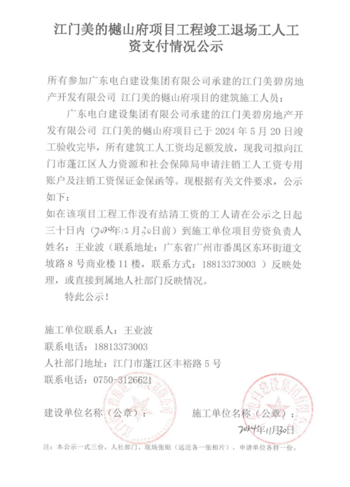 現(xiàn)將樾山府1幢、2幢~7幢、8幢(文體中心)、9幢~13幢、一期地下室(絕對標高13.25、16.55、20.05地下室)、二期地下室(絕對24.25、27.55、31.15、34.45地下室)、電梯、門衛(wèi)室、商業(yè)1#、商業(yè)2#工程項目《工程竣工退場工人工資支付情況公示》掛網(wǎng)公示如下,如發(fā)現(xiàn)該項目存在欠薪等相關(guān)情況的,請在30日內(nèi),請攜帶相關(guān)佐證材料,到施工單位項目或者人社部門反映情況。