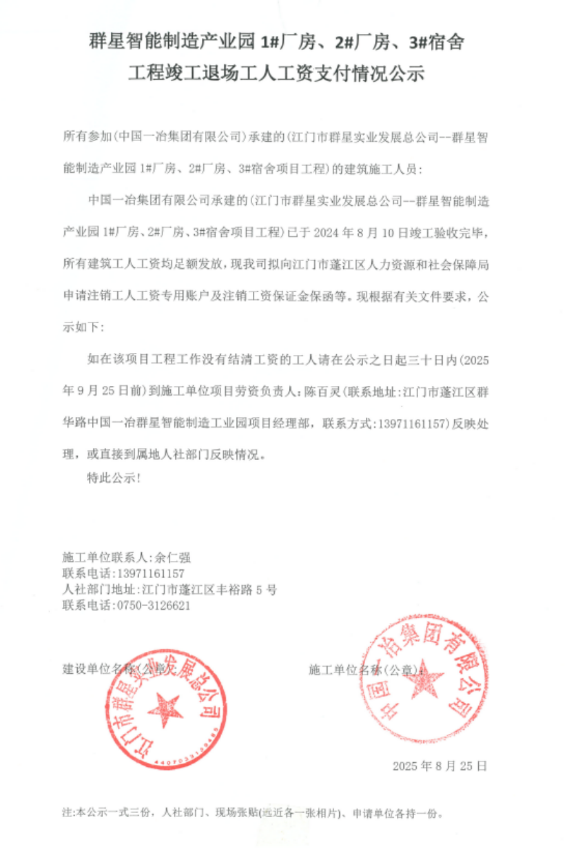 現(xiàn)將江門利泰成全季酒店項(xiàng)目工程《工程竣工退場工人工資支付情況公示》掛網(wǎng)公示如下,如發(fā)現(xiàn)該項(xiàng)目存在欠薪等相關(guān)情況的,請?jiān)?0日內(nèi),請攜帶相關(guān)佐證材料,到施工單位項(xiàng)目或者人社部門反映情況。