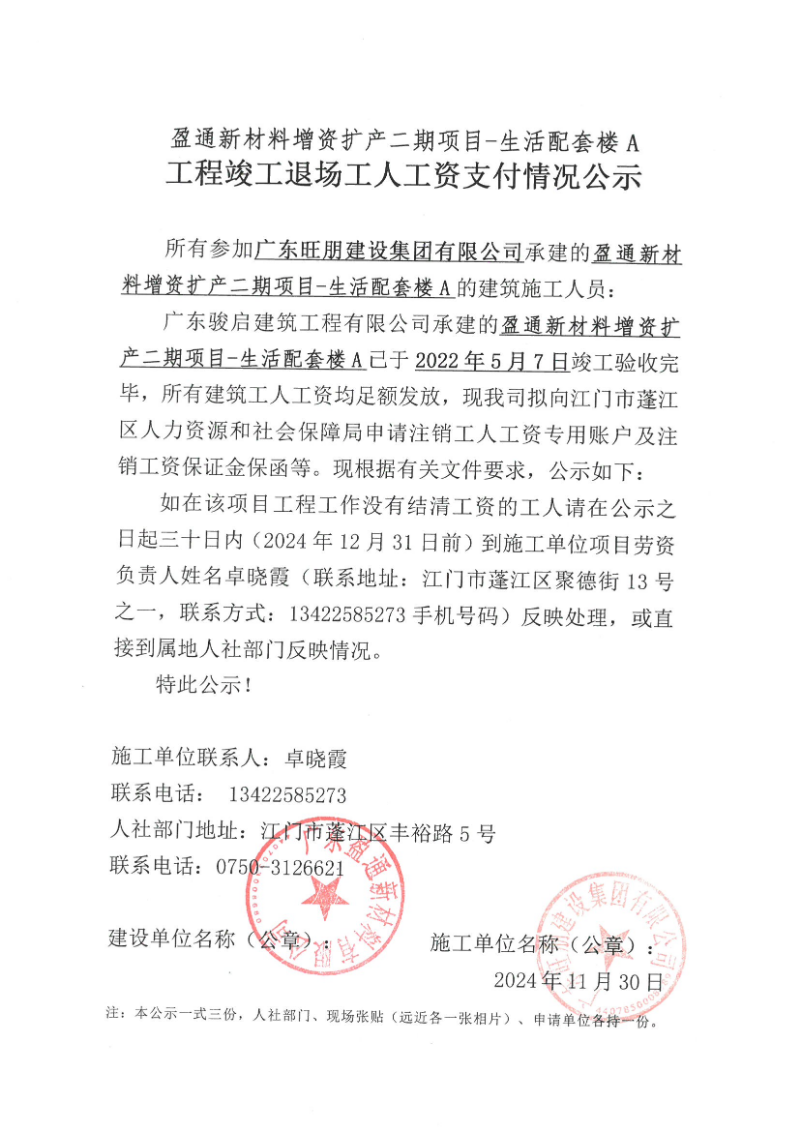 現(xiàn)將盈通新材料增資擴(kuò)產(chǎn)二期項(xiàng)目—生活配套樓A工程《工程竣工退場(chǎng)工人工資支付情況公示》掛網(wǎng)公示如下,如發(fā)現(xiàn)該項(xiàng)目存在欠薪等相關(guān)情況的,請(qǐng)?jiān)?0日內(nèi),請(qǐng)攜帶相關(guān)佐證材料,到施工單位項(xiàng)目或者人社部門反映情況。