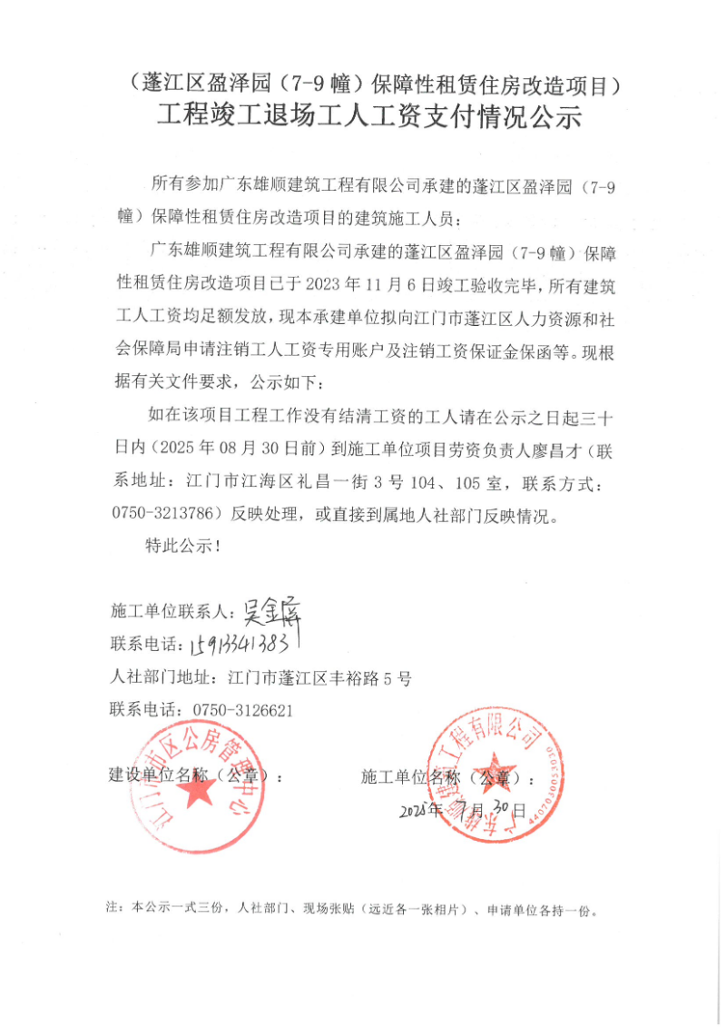 現(xiàn)將蓬江區(qū)盈澤園(7-9幢)保障性租賃住房改造項目《工程竣工退場工人工資支付情況公示》掛網(wǎng)公示如下,如發(fā)現(xiàn)該項目存在欠薪等相關(guān)情況的,請在30日內(nèi),請攜帶相關(guān)佐證材料,到施工單位項目或者人社部門反映情況。