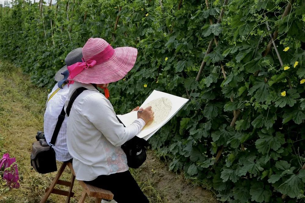 田間溝壑間,不僅有農(nóng)戶、游客在采摘瓜果,還有攝影愛好者、繪畫愛好者忙著采風(fēng)。