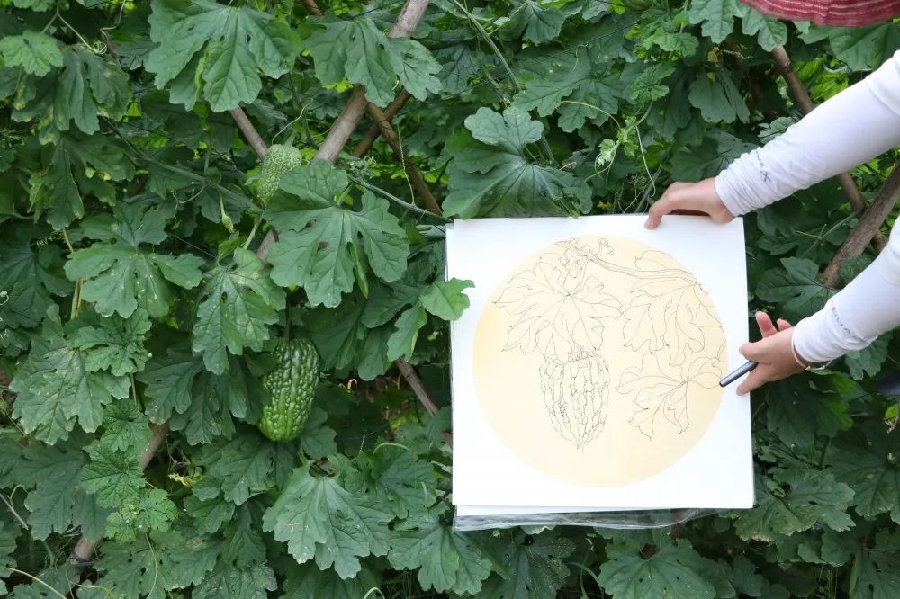 杜阮鎮(zhèn)居民呂月笑和她的朋友,把小板凳搬到了田間,一起對(duì)著還掛在籬笆上的杜阮涼瓜進(jìn)行速寫,不到10分鐘,一幅栩栩如生的杜阮涼瓜圖就完成了。