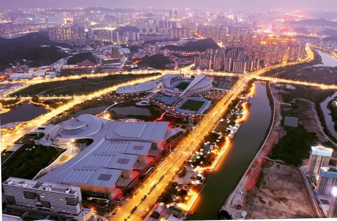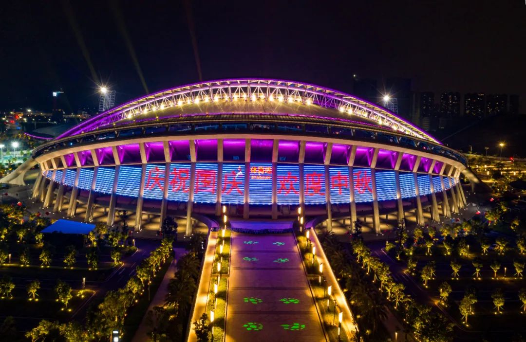 夜幕下的珠西國際會展中心和江門體育中心分外迷人。江門日報記者/周華東 攝