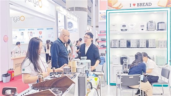 外國客商在一家蓬江區(qū)家電企業(yè)的展區(qū)前洽談合作。任佳燕 攝