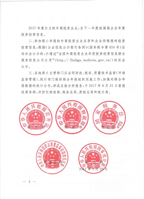 附件:《商務(wù)部 財(cái)政部 稅務(wù)總局 質(zhì)檢總局 統(tǒng)計(jì)局關(guān)于開(kāi)展2017年外商投資企業(yè)年度投資經(jīng)營(yíng)信息聯(lián)合年報(bào)工作的通知》(商資函〔2017〕130號(hào))