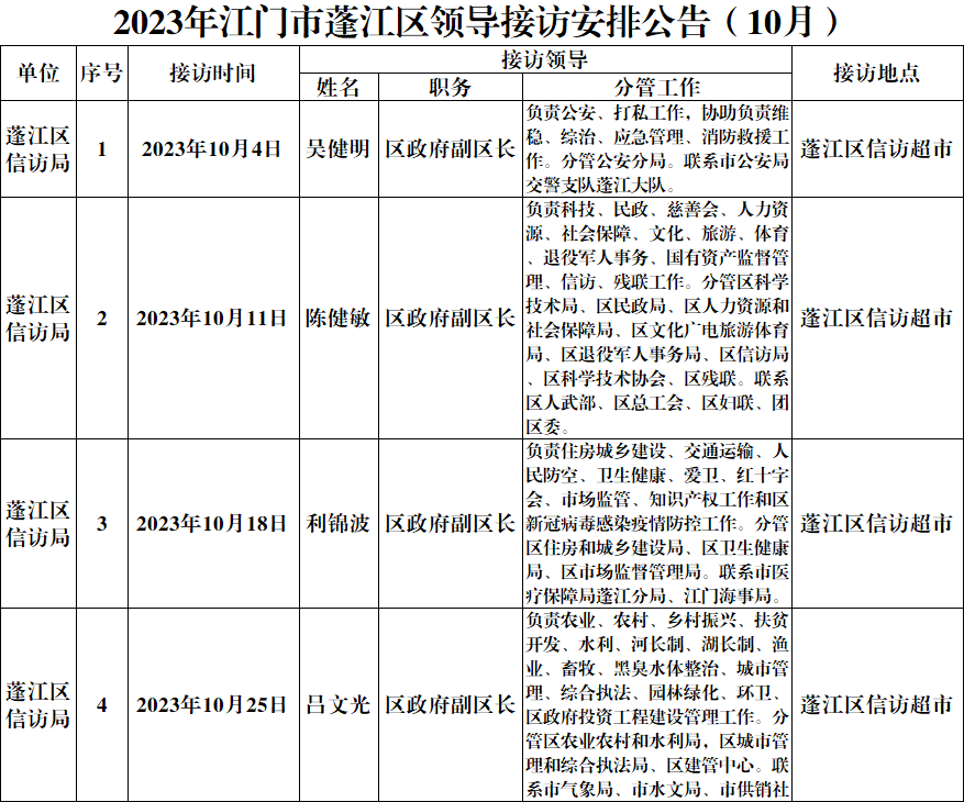 2023年江門市蓬江區(qū)領(lǐng)導(dǎo)接訪安排公告(10月)