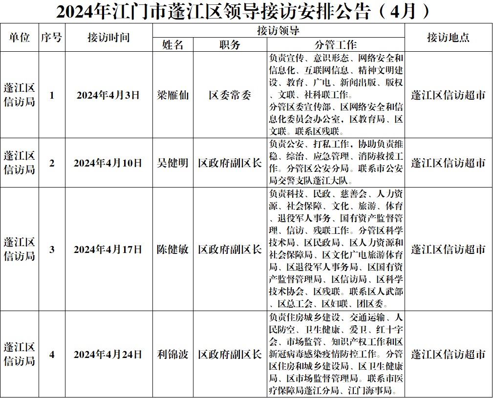 2024年江門市蓬江區(qū)領(lǐng)導(dǎo)接訪安排公告(4月)
