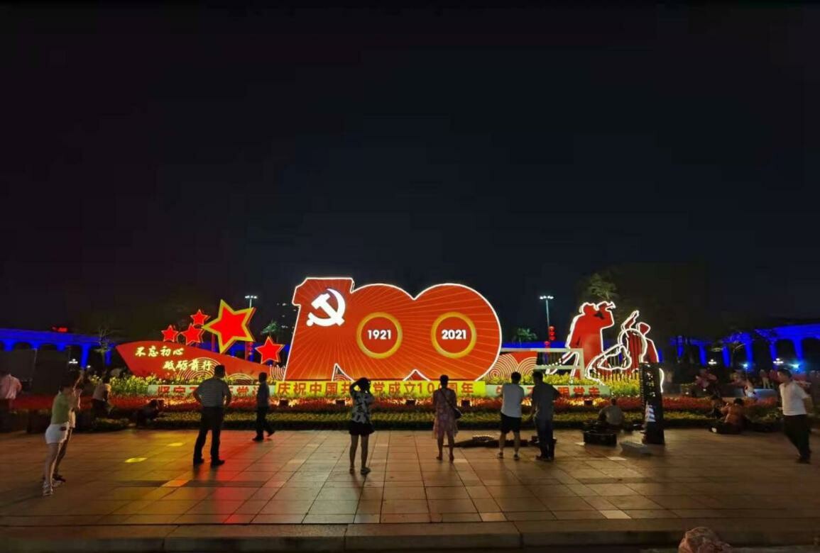 萬達(dá)廣場以“勇毅前行 續(xù)寫紅色篇章”為主題的組景造型,主要由紅旗和帶有星星圖案的波浪線組成。寓意100年來,中國共產(chǎn)黨帶領(lǐng)全國各族人民前仆后繼、頑強(qiáng)奮斗,不斷取得革命、建設(shè)、改革的重大勝利,期間嘗盡了艱難困苦,卻初心不改,矢志奮斗。在往后繼續(xù)帶領(lǐng)人民勇毅前行,續(xù)寫紅色篇章。