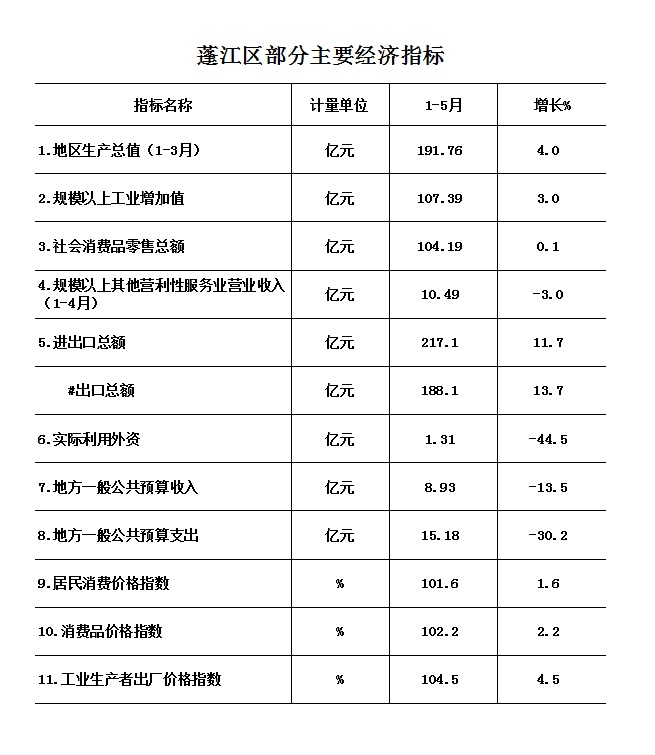 5月以來(lái),蓬江區(qū)部分指標(biāo)運(yùn)行有所向好,但整體勢(shì)頭未見明顯改善,經(jīng)濟(jì)增長(zhǎng)壓力仍然存在較多不確定因素。