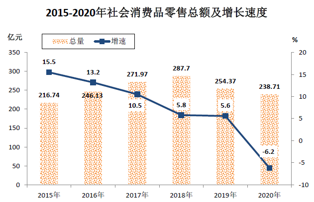 全年社會消費(fèi)品零售總額238.71億元,比上年下降6.2%。分行業(yè)看,限上批發(fā)和零售業(yè)零售額106.76億元,下降10.5%;限上住宿和餐飲業(yè)零售額7.38億元,下降14.08%。