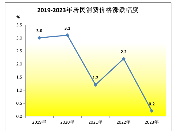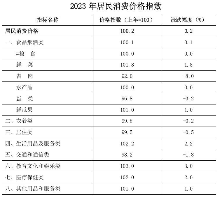 全年居民消費(fèi)價(jià)格比上年上漲0.2%。分類別看,食品煙酒類價(jià)格上漲0.1%,衣著類價(jià)格下降0.2%,居住類價(jià)格下降0.5%,生活用品及服務(wù)類價(jià)格上漲2.2%,交通通信類價(jià)格下降1.8%,教育文化娛樂類價(jià)格上漲3.0%,醫(yī)療保健類價(jià)格上漲2.0%,其他用品及服務(wù)類價(jià)格上漲1.0%。工業(yè)生產(chǎn)者出廠價(jià)格下降1.1%,其中輕工業(yè)下降0.5%,重工業(yè)下降1.7%。