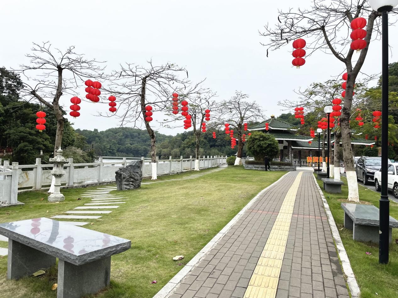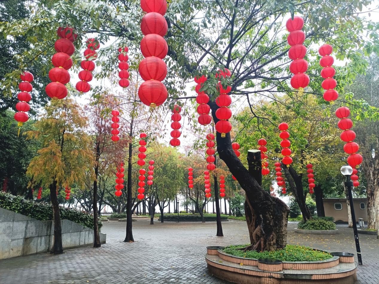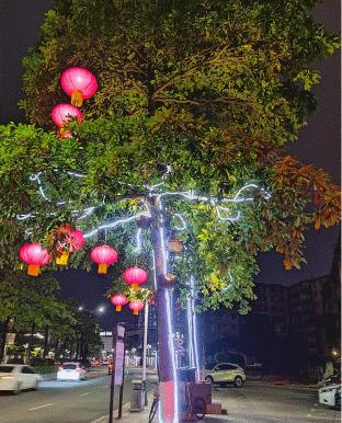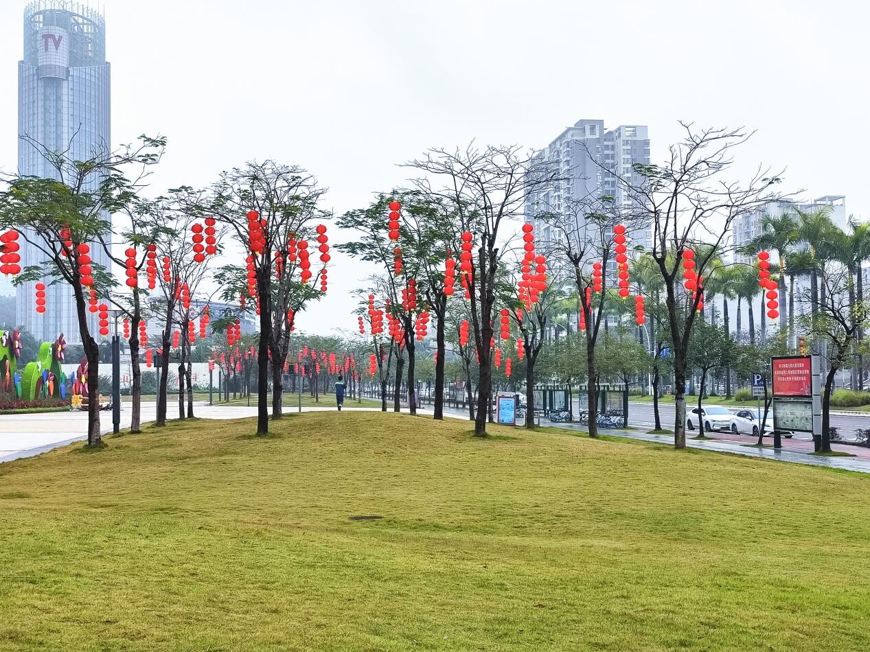 一個個紅燈籠悄然地爬上樹梢,為蓬江街頭增添春節(jié)氣息