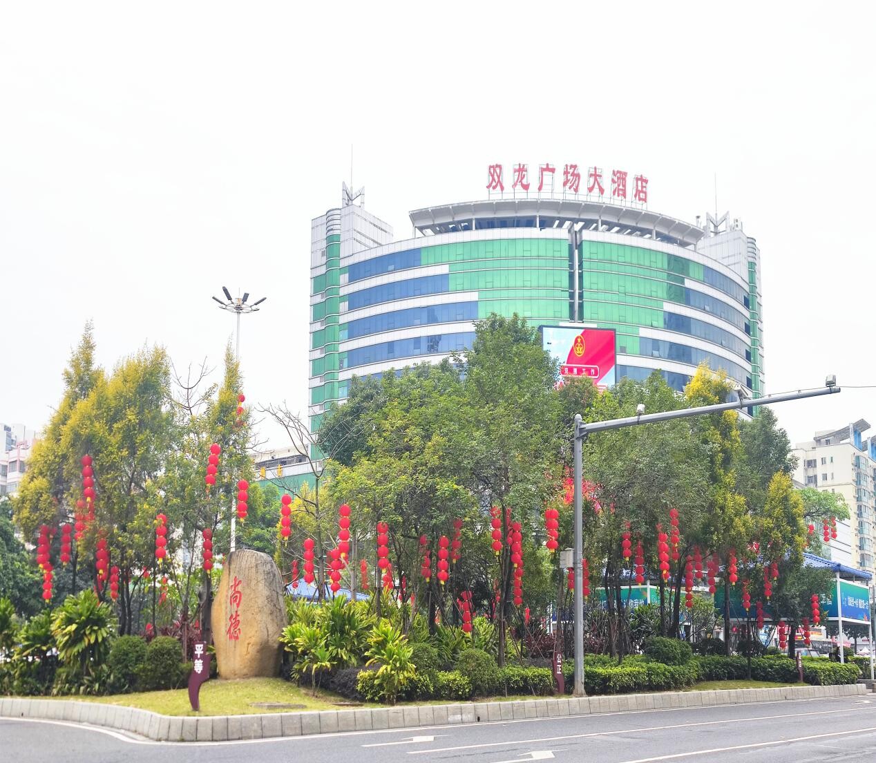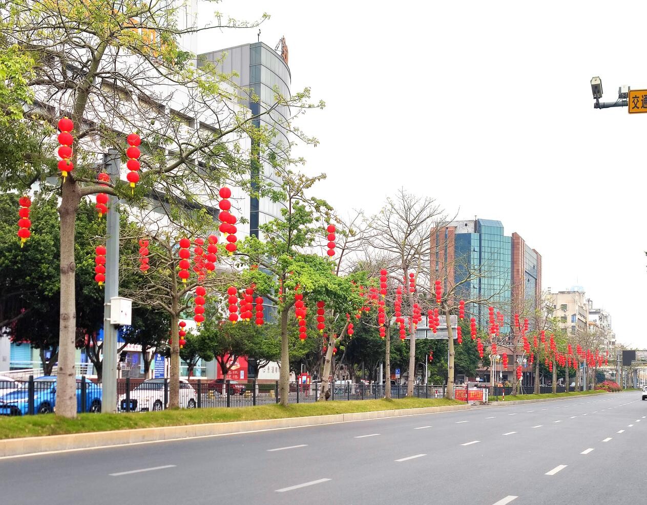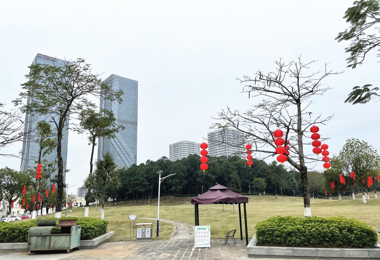 一個個紅燈籠悄然地爬上樹梢,為蓬江街頭增添春節(jié)氣息