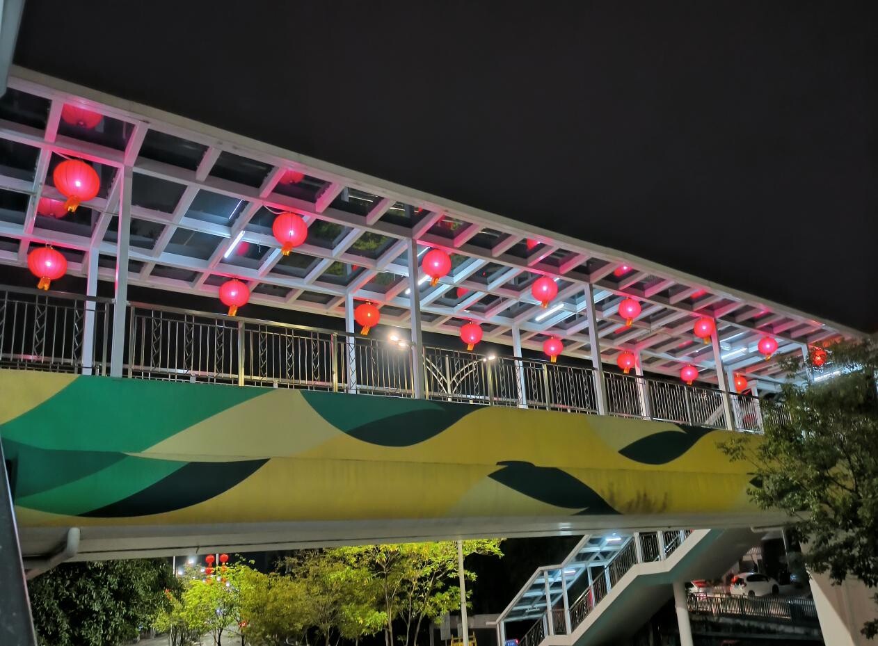 人行天橋兩排都懸掛了大紅燈籠,晚上顯得格外耀眼