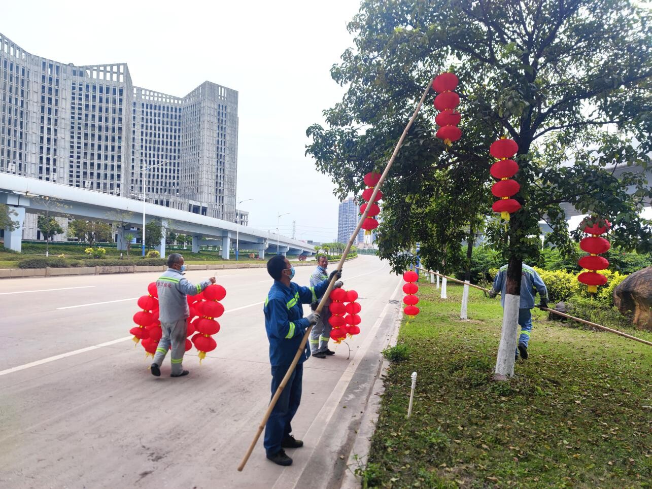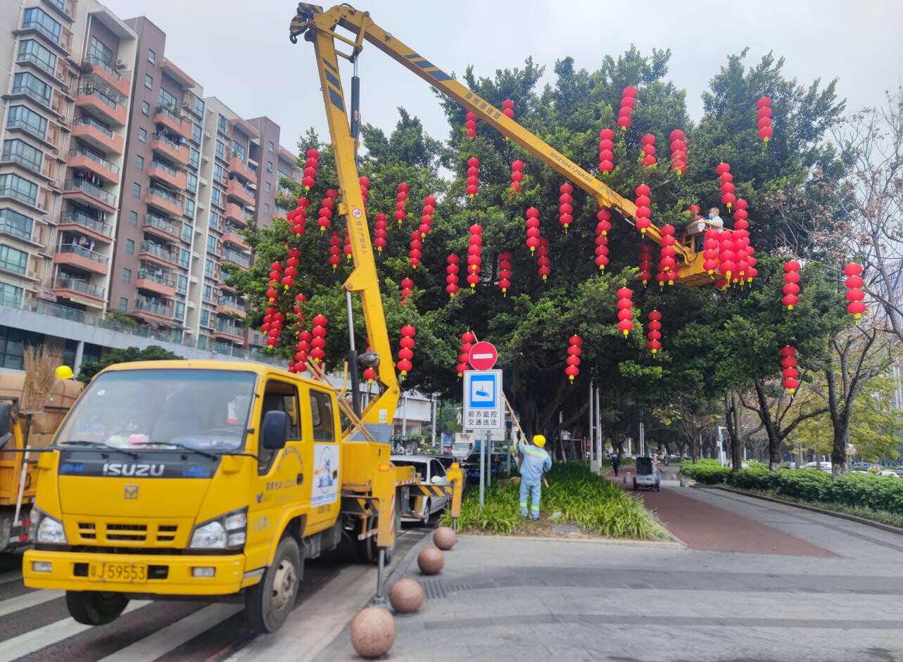 市政工人把紅燈籠懸掛在樹上,一片片象征著春節(jié)的“中國紅”,彌漫在蓬江的大街小巷